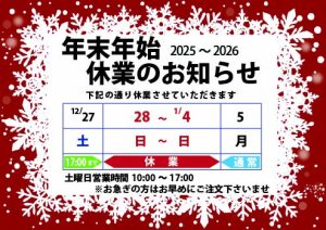 2025 年 12 月 24 日 – AM 11:29 年末年始 休業のお知らせ 2025年12月28日(日)~2026年1月4日(日)迄お休みいただきます オンラインショップからご注文承ります 商品の発送・引き渡し、校正などは2026年1月5日(月)以降となります ご了承くださいませ 2026年もよろしくお願いいたします